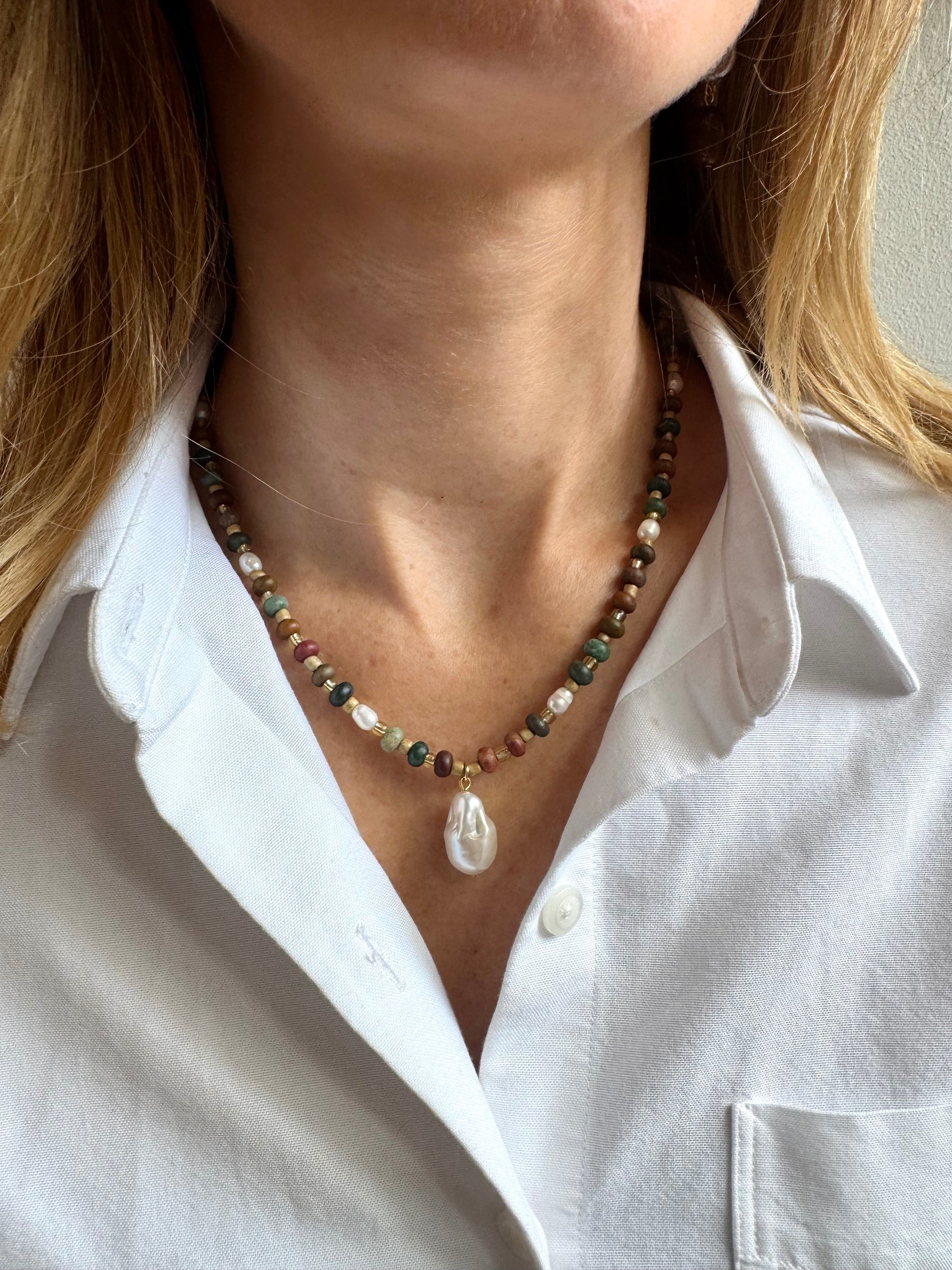 A summer favorite reimagined for fall. Rooted in natural texture and tone, this necklace features ocean jasper beads, freshwater pearls, gold accents, and a baroque pearl pendant. Finished with a lobster clasp and a 2-inch extender for adjustable length.
